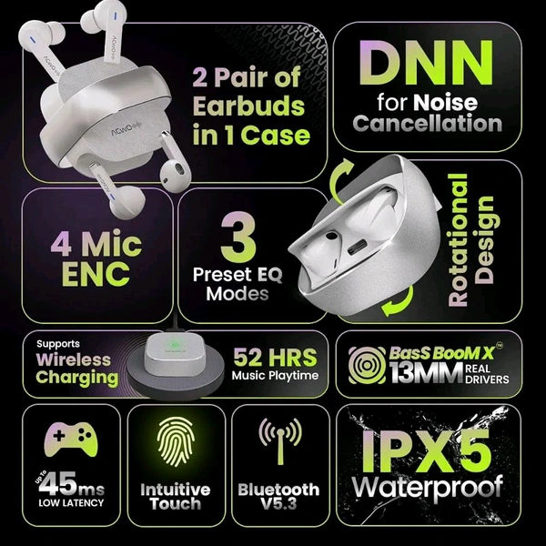 ACwO DwOTS Fire India's First in-Ear + Half-in-in Ear Earbuds in one case, 3+3 EQ Modes, Wireless Charging Enabled, AI-ENC with Quad Mic (Cosmic Silver)