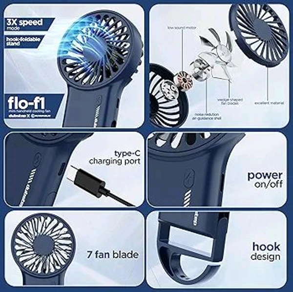Dubstep Flo-F1 Mini Handheld USB Rechargeable Desk Cooling Fan with 3x Speed Mode,Foldable Hook & Stand,8000 RPM,3 Speed,Powerful Mini Fan for Travel,Office,Kitchen,Lightweight & Quiet (Blue) 7 Cm