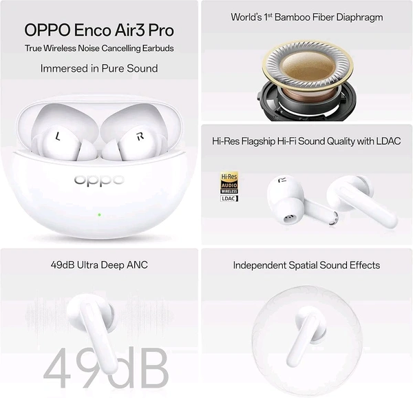 OPPO Enco Air3 Pro True Wireless in Ear Earbuds with Industry First Composite Bamboo Fiber, 49dB ANC, 30H Playtime, 47ms Ultra Low Latency,Fast Charge,BT 5.3 (White)