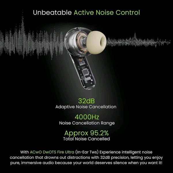 DwOTS Fire Ultra | 75Hrs Playtime | Quad Mics with ANC | 40ms Low Latency | Trans ANC Mode | Dual Sharing & Individual Connectivity | LED Battery Display | Voice Assistant Integration - Pastel Crème