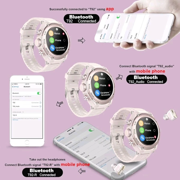 Tuanzi T92 Smart Watch with Earbuds MP3 Bluetooth Headset 3 in 1 1.28 Inch Smartwatch Built-in Wireless Earbuds Speaker Round Fitness Tracker Music Health Monitor (Pink)